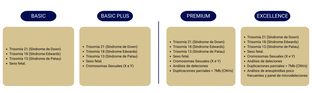Analiza ADN fetal libre en sangre materna para detectar: Trisomía 21 (Síndrome de Down), Trisomía 18 (Síndrome de Edwards), Trisomía 13 (Síndrome de Patau), sexo fetal, cromosomas sexuales, análisis de deleciones y duplicaciones parciales > 7Mb (CNVs)*, análisis de aneuploidías poco frecuentes y el panel de microdeleciones*.